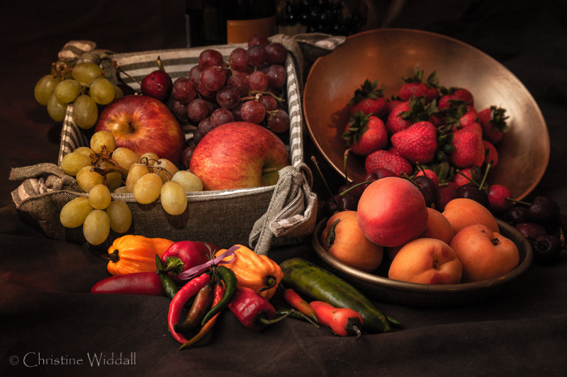 Fruit still life with black and white cat